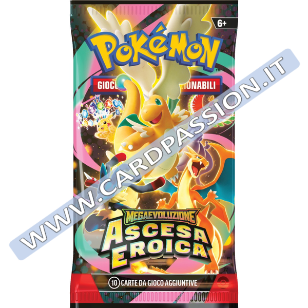 Pacchetto Pokémon dell'espansione Megaevoluzione Ascesa Eroica in lingua italiana. Artwork Casuale. Acquistando il prodotto riceverai un pacchetto con artwork casuale sulla base delle disponibilità di magazzino.
